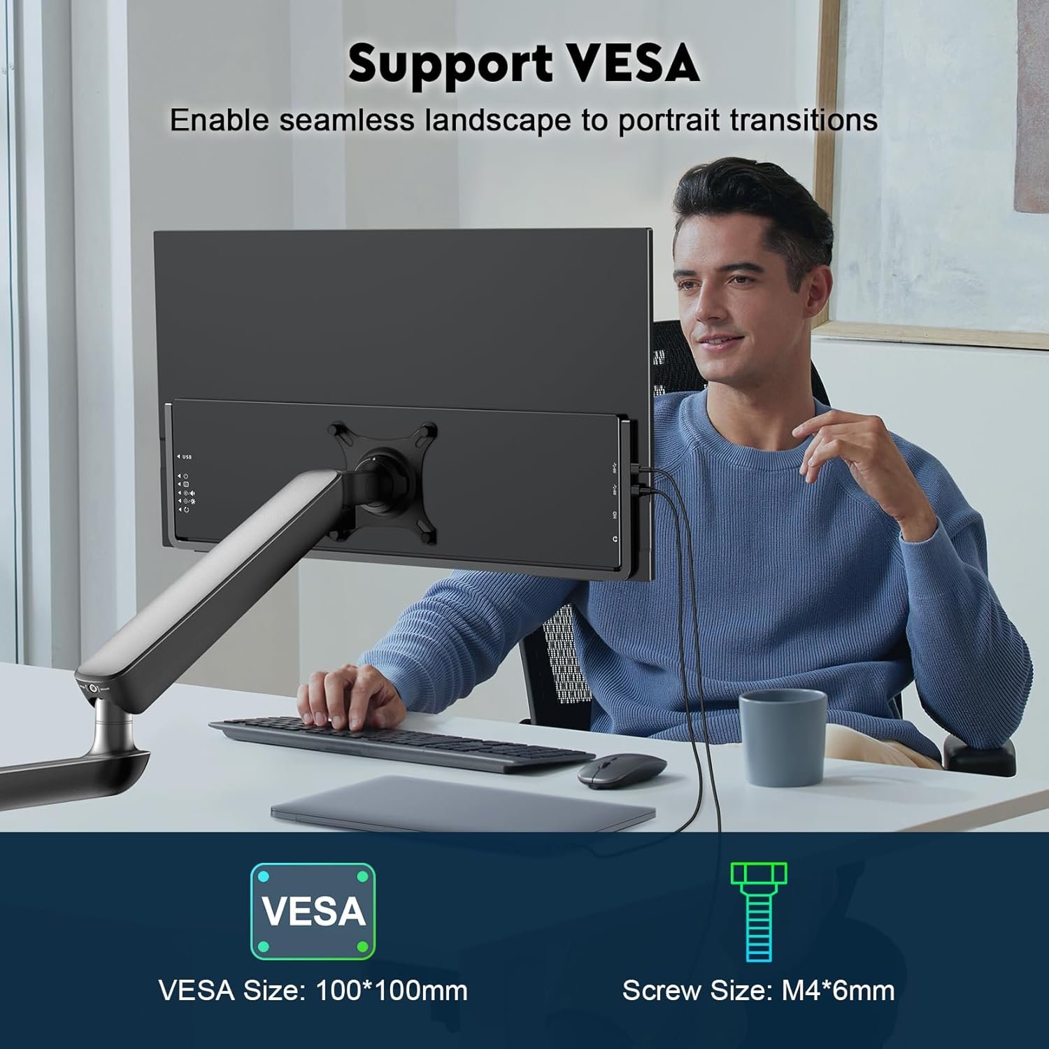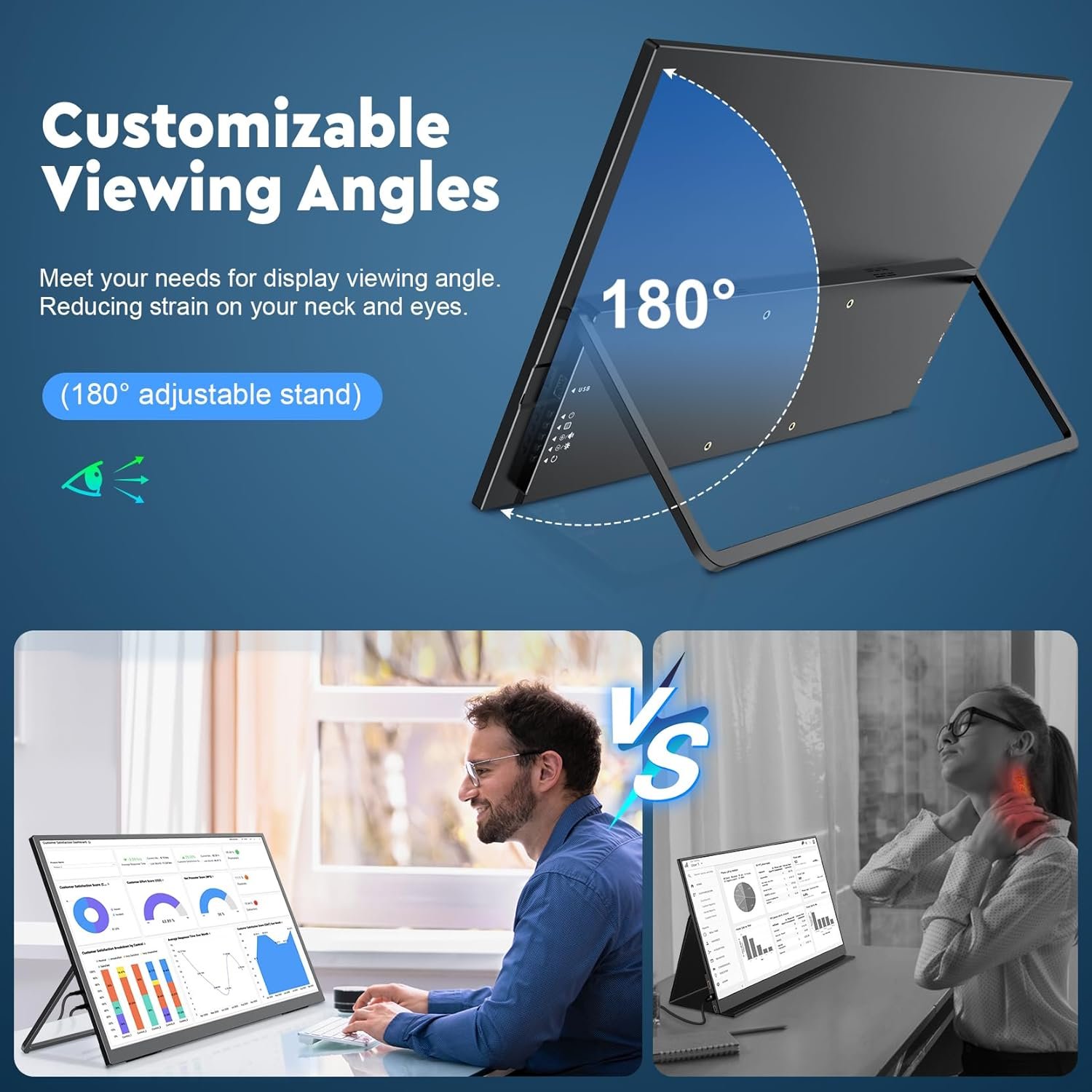 【180° Adjustable Stand and VESA Compatibility】This external Screen features a 180° rotatable stand, allows you to set the monitor at the perfect angle for comfort during use. VESA(M4*6mm) compatibility lets you mount the monitor easily on walls or adjustable arms for enhanced flexibility.