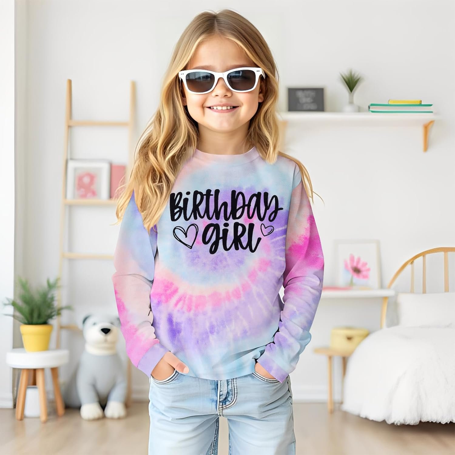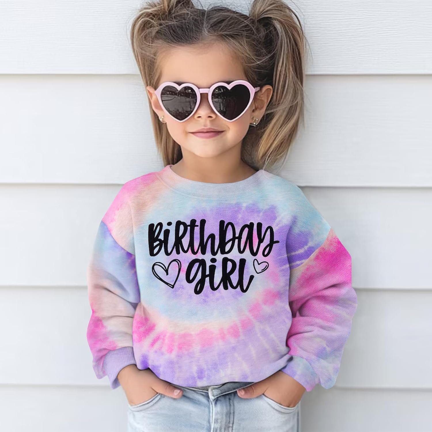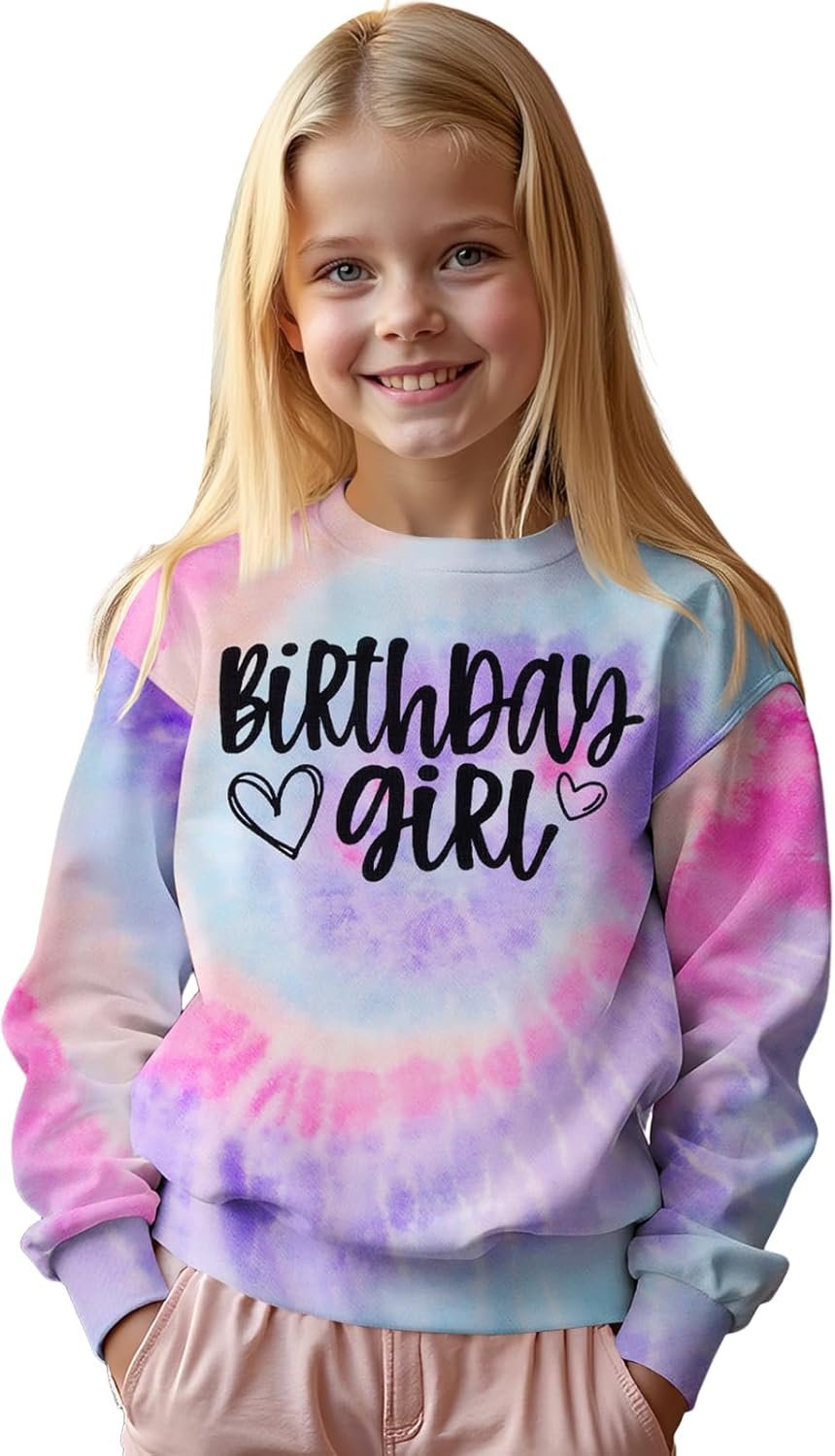 BOUTIKOME Birthday Sweatshirts Girls Toddler Kid Tie Dye Long Sleeve Shirt B-day Outfits Gifts Party Pullover Fall Tops 3-10Y