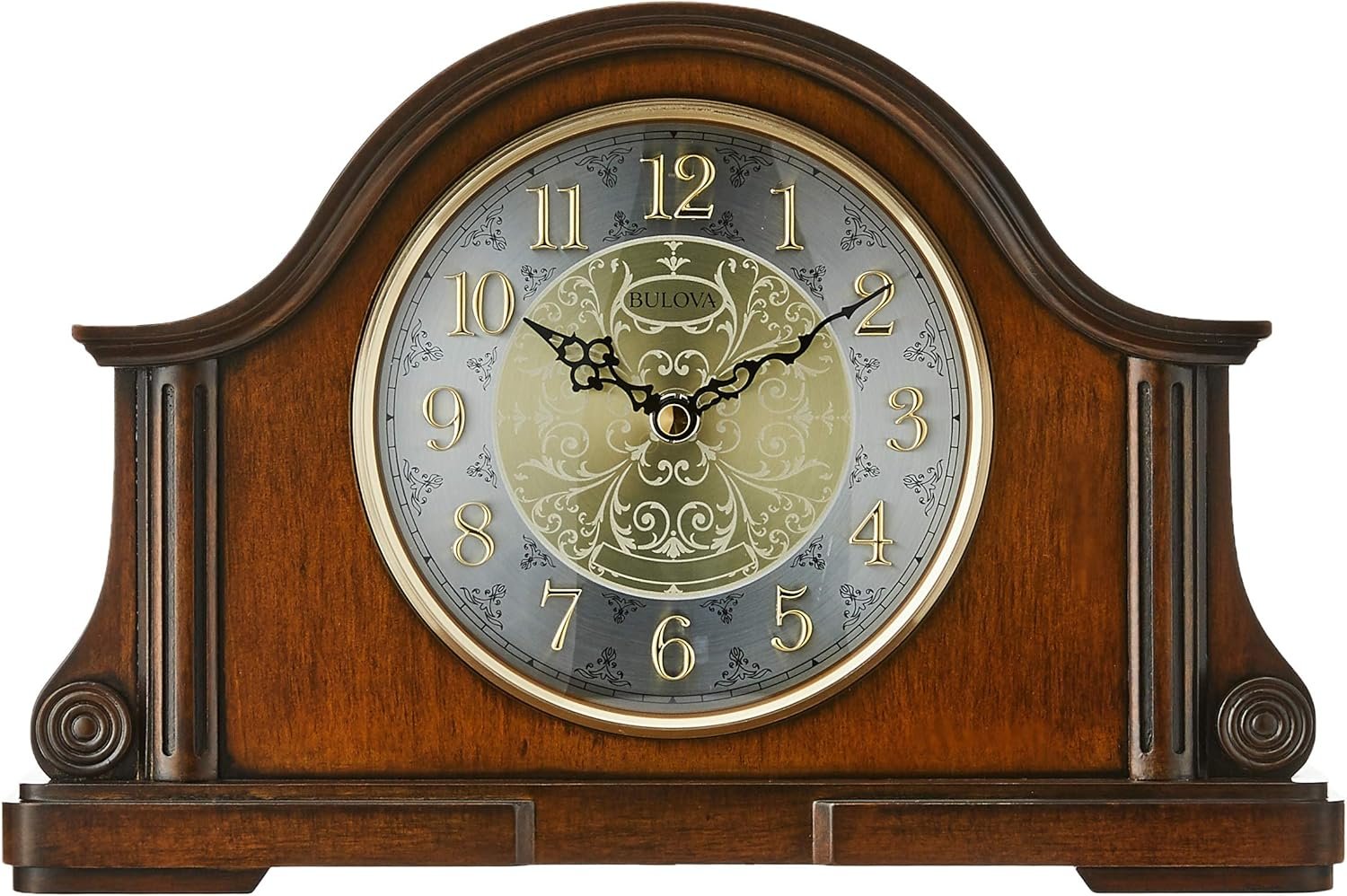 Solid wood and wood veneer case, Old World walnut finish. Brass finish diamond cut metal bezel. Two-tone metal dial with raised numerals. Harmonic 2 triple-chime movement plays choice of Westminster, Ave Maria or Bim-Bam melody on the hour. Quarter-hour Westminster chime and strike available. Adjustable volume control. Automatic night shutoff available. Convex glass lens. Engraving plate included.