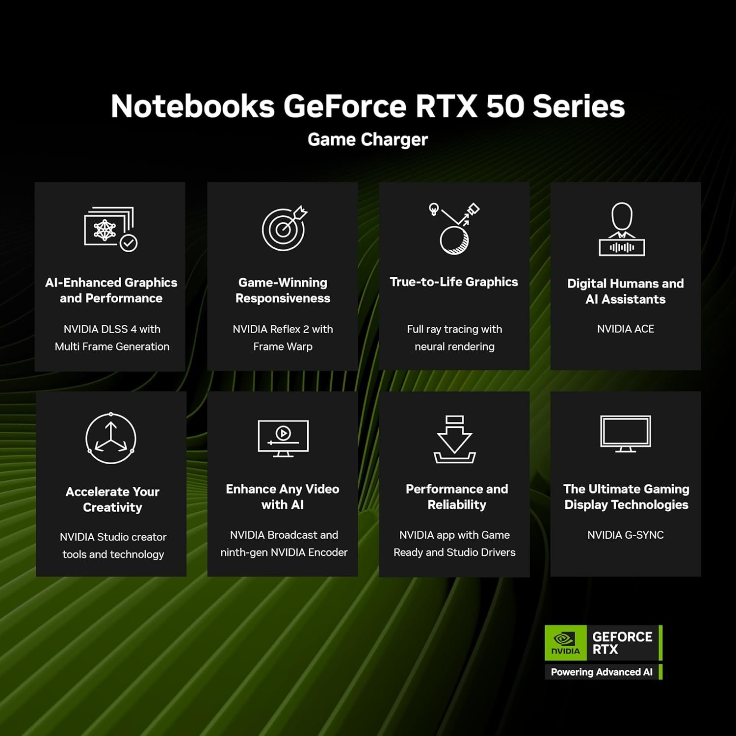 NVIDIA GeForce RTX 5070 Laptop GPU – Powered by NVIDIA Blackwell, GeForce RTX 5070 Laptop GPUs bring game-changing capabilities to gamers and creators. Equipped with a massive level of AI horsepower, the RTX 50 Series enables new experiences and next-level graphics fidelity. Multiply performance with NVIDIA DLSS 4, generate images at unprecedented speed, and unleash your creativity with NVIDIA Studio. All in the thinnest and longest lasting RTX laptops, optimized by Max-Q.