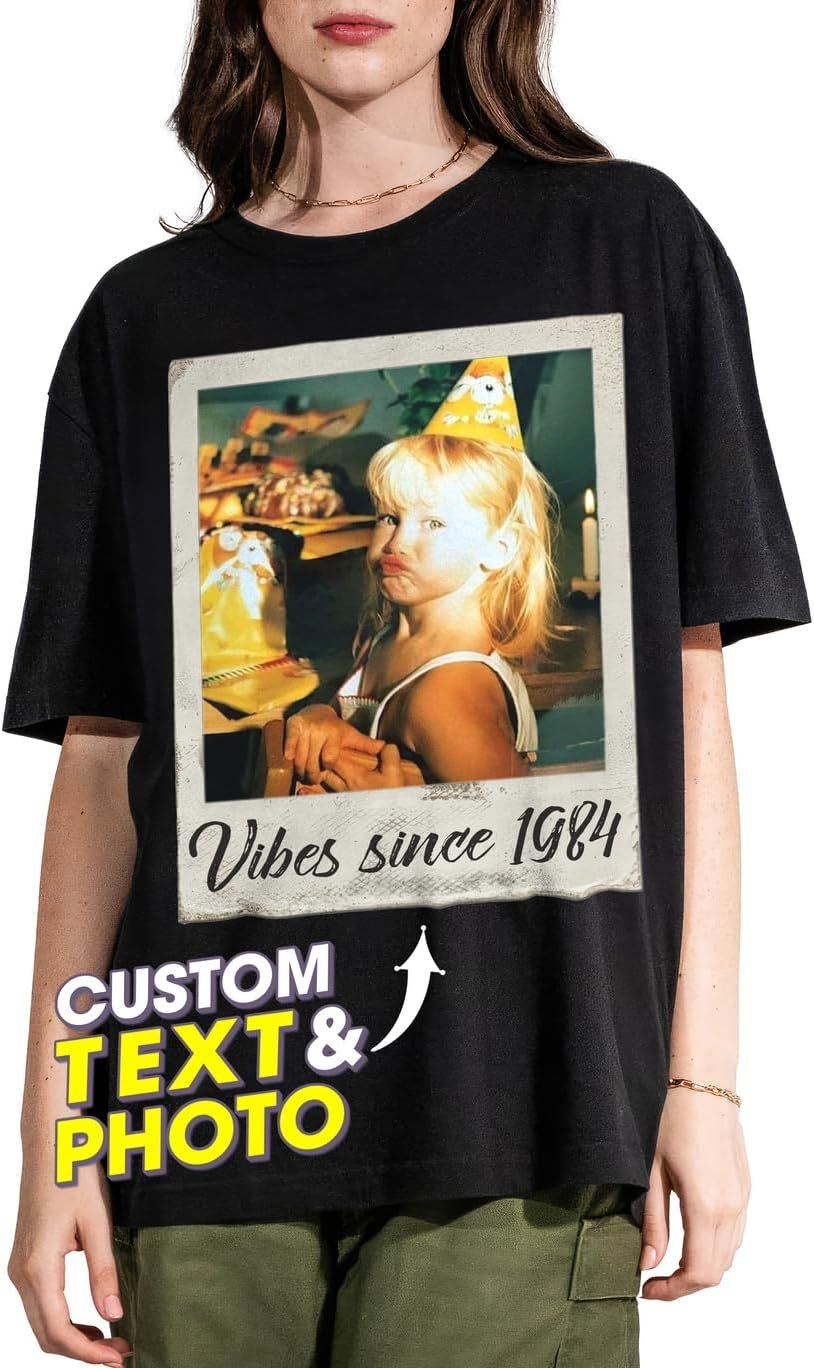 Capture timeless moments and embrace the timeless appeal of vintage tees with our custom shirts. Whether featuring your favorite photo and meaningful text or showcasing a beloved pet or family portrait, each shirt becomes a wearable piece of art that tells your unique story, great for reliving unforgettable moments and celebrating life’s journey in a fashionable, personal way.