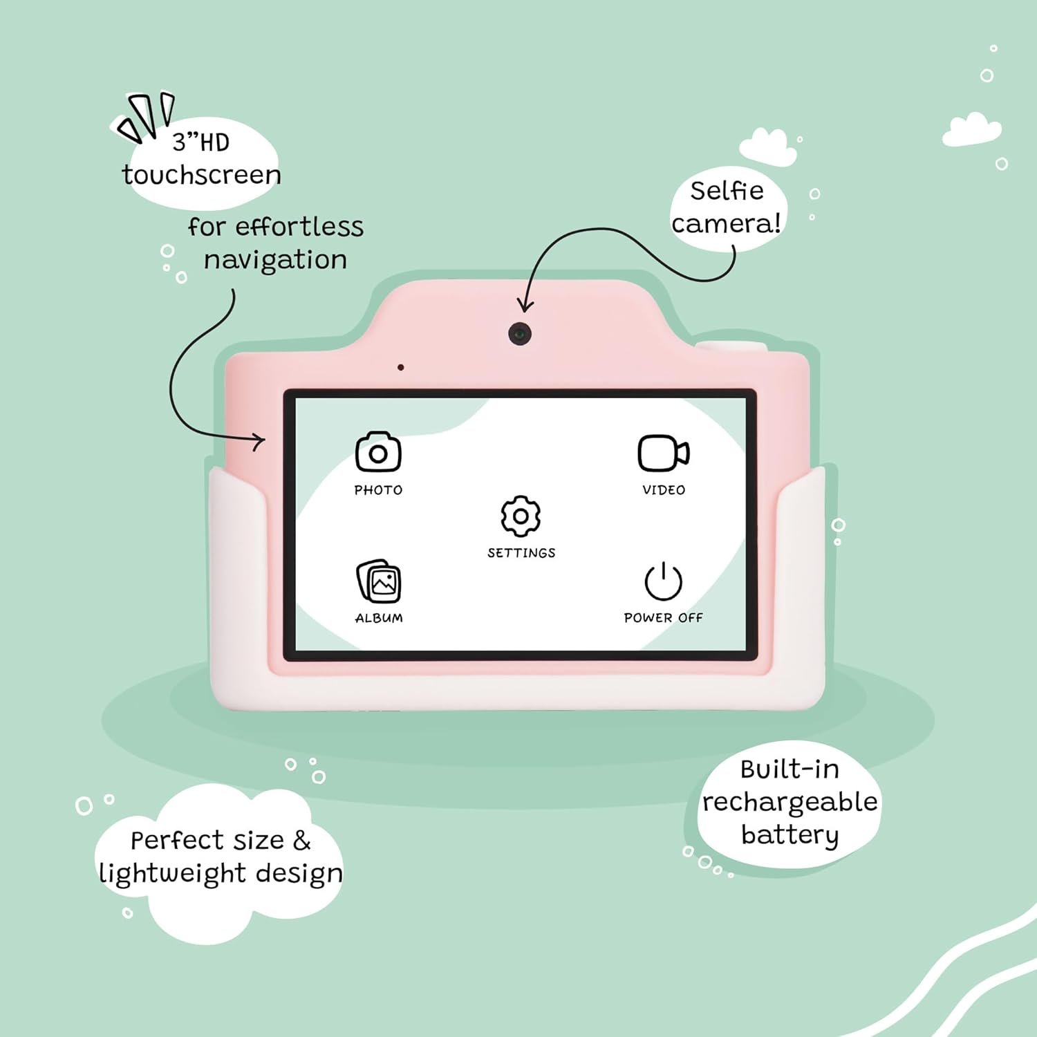 Model K is the ultimate camera designed for kids aged 5 to 8. Its large HD touchscreen ensures effortless navigation, while the built-in selfie camera adds an extra element of fun. The camera’s rear lens cap is conveniently attached to the soft silicone case, ensuring added protection.
