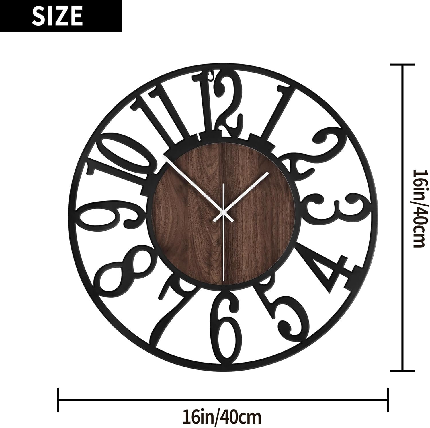[Long-lasting Quality Clock] The large black metal clock has a hollowed-out retro design. The strength and retro appearance of the Arabic Numbers wall clock are ensured by the use of high-quality 2cm thick iron materials in the handcrafted, solid iron frame and showing the wooden face.