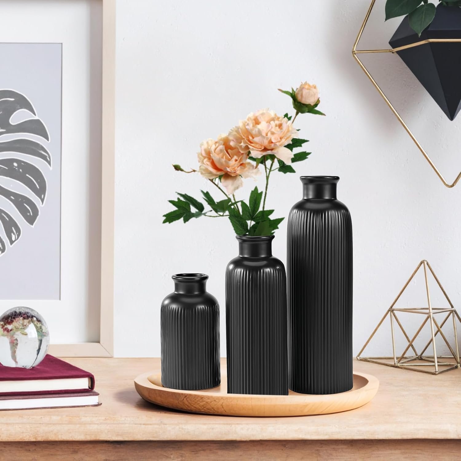 Elevate your home decor with this set of three modern black ceramic vases. Featuring a sleek, minimalist design, these vases are perfect for displaying fresh or artificial flowers, adding a touch of elegance to any room.