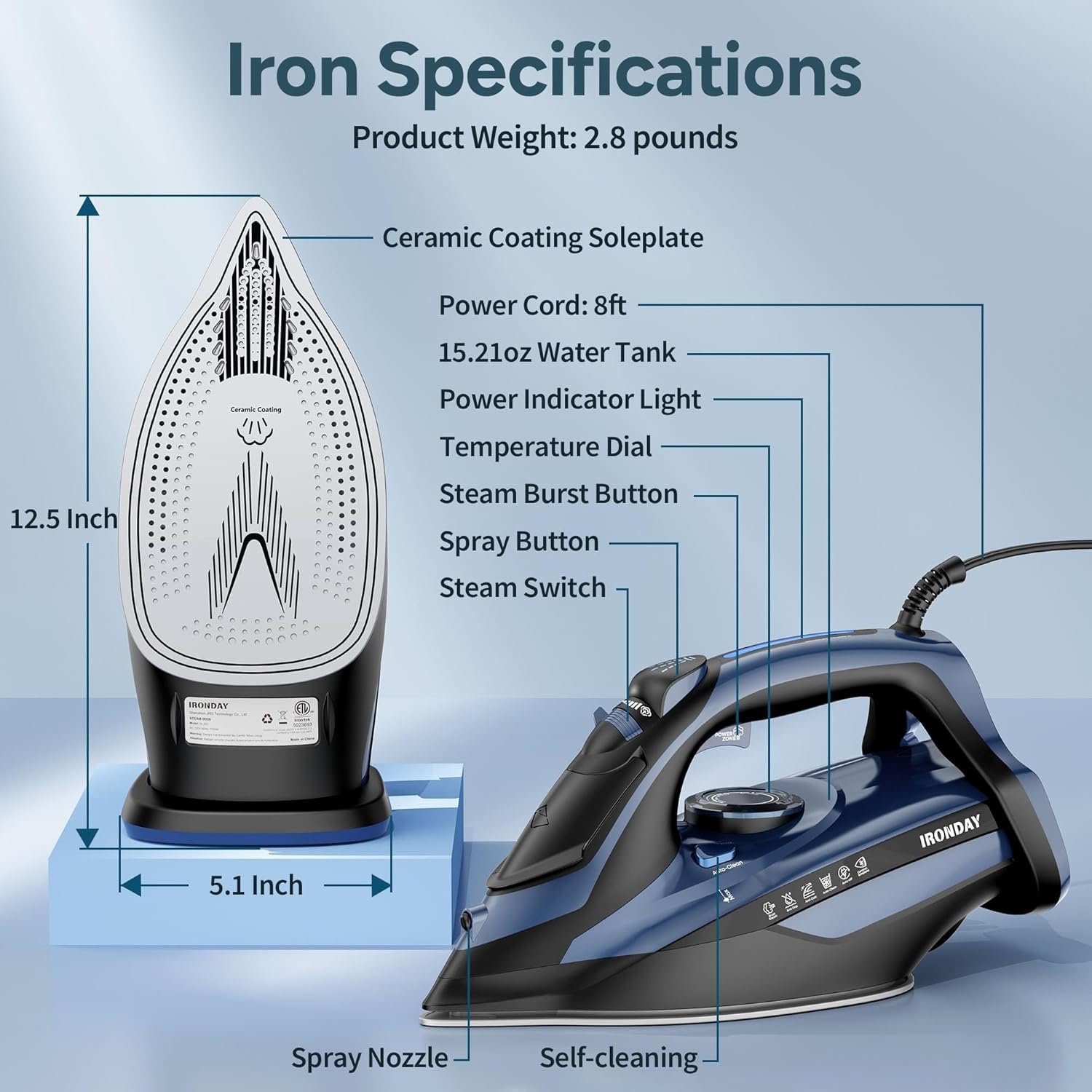 [Quality Tested] Each IRONDAY steam iron is WATER TESTED before leaving the factory to ensure the quality and safety of the product, so some water may remain in the water tank, which is NOMAL for the pre-testing process