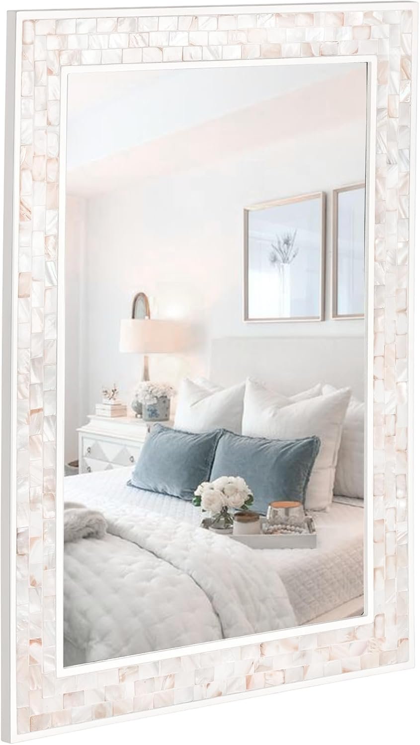 Tanmicoshomy 20x 28 Inch Rectangle Wall Mirror, Natural Shell Framed Rectangular Mirror for Bathroom, Vanity, Bedroom, Living Room, Entryway, Wall Mounted Horizontal or Vertical, White
